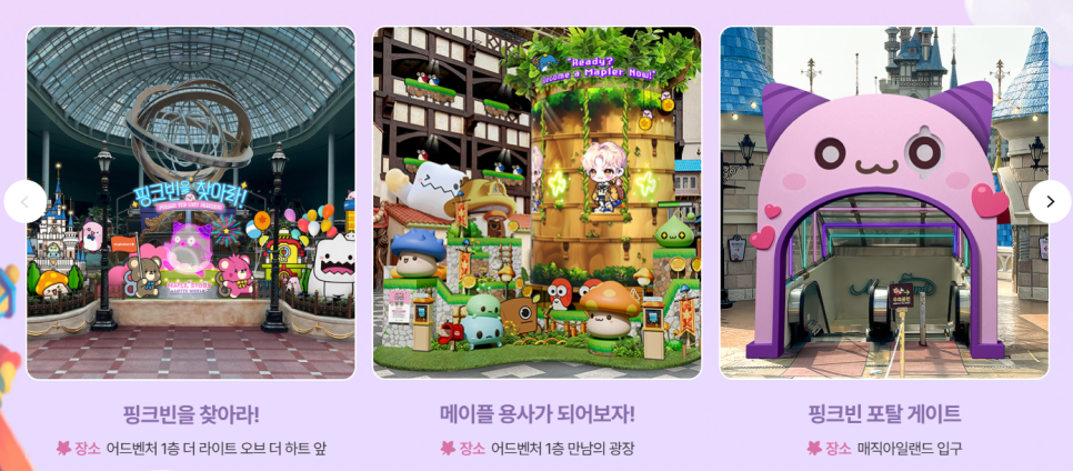 핑크빈을 찾아라, 메이플 용사가 되어보자, 핑크빈 포털 게이트, 헤네시스 마을, 아르카나 정령의 나무 총 다섯 곳의 포토존이 마련되어 있습니다. 특히 헤네시스 마을은 저렙 시절부터 고렙이 되어서도 자주 찾게 되는 그 마을을 실제로 구현해 놓은 공간인 만큼, 오래 메이플을 해온 분들이라면 감회가 남다를 것 같습니다.
