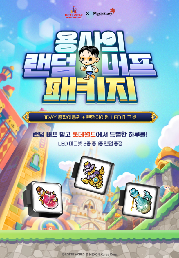 이번 콜라보의 핵심 패키지입니다. 롯데월드 종합이용권과 함께 랜덤 버프 LED 마그넷이 포함된 구성으로, 게임 속 물약 모양을 그대로 재현한 디자인이 눈에 띕니다. 메이플을 조금이라도 해보신 분이라면 바로 알아볼 수밖에 없는 그 물약입니다. 이미지로만 봐도 퀄리티가 상당한데, 실물 크기도 생각보다 꽤 있다고 하니 소장 가치는 충분해 보입니다.