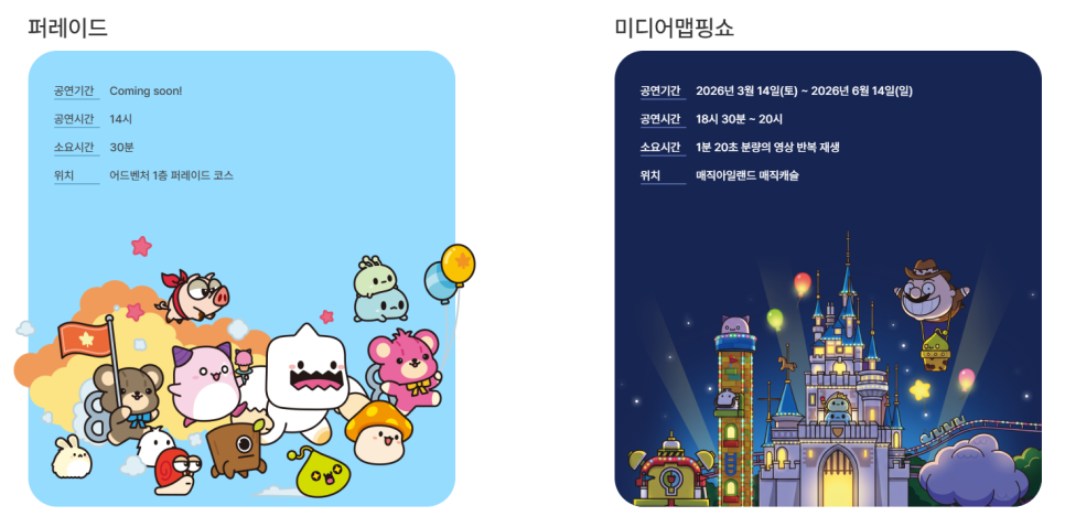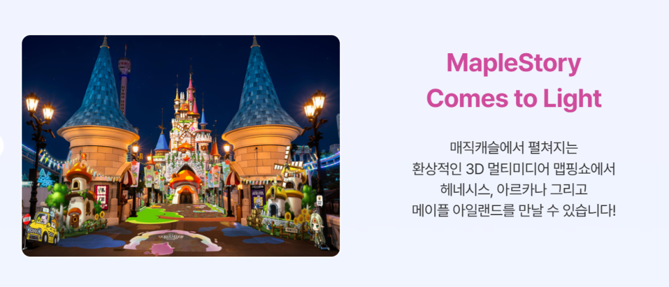 매직 캐슬에서는 3D 멀티미디어 맵핑쇼가 진행됩니다. 헤네시스, 아르카나, 메이플 아일랜드를 배경으로 한 영상이 상영되며, 오후 6시 30분부터 8시까지 1분 20초 분량의 영상이 반복 재생됩니다. 로티스 어드벤처 퍼레이드 등 추가 공연도 추후 공개될 예정입니다.