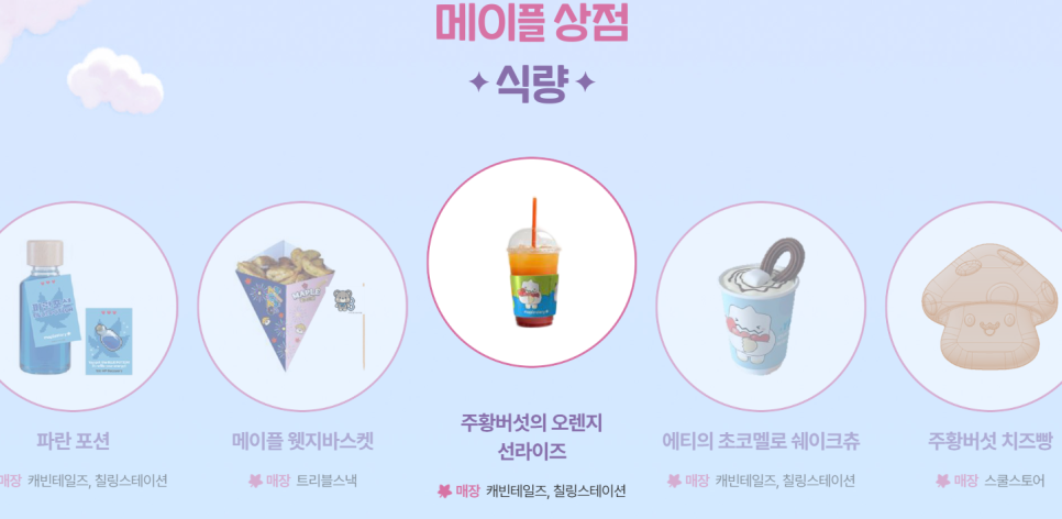 주황버섯의 오렌지 선라이즈, 주황버섯 치즈빵, 에티의 초코멜로 쉐이크 츄 등 캐릭터 이름을 그대로 붙인 메뉴들이 판매됩니다. 보는 것만으로도 귀여운데, 맛까지 있다면 금상첨화겠죠.